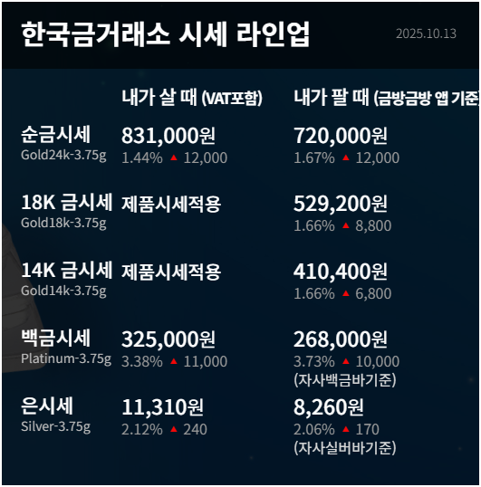 2020년 초 금 가격이 1g당 56,000원 내외였는데, 2025년 10월 현재 한국거래소(KRX) 금 시세는 약 8만 5천 원~8만 8천 원 수준을 유지하고 있습니다.