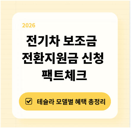 2026년 전기차 보조금은 기후부 무공해차 통합누리집에서 실시간 지자체 잔여 현황을 확인할 수 있습니다. 보조금은 차량 가액 5,300만 원 미만일 때 100% 비례 지급되며, 내연기관차 폐차 시 지급되는 전환지원금 최대 100만 원은 일반 보조금과 중복 수혜가 가능합니다. 테슬라는 모델별 성능 계수에 따라 최종 보조금이 결정되므로 지자체별 공고를 반드시 확인해야 합니다.